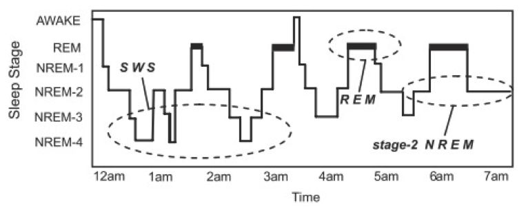 人们正常的睡眠结构周期分两个时相:非快速眼动睡眠期(NREM)和快速眼动睡眠期(REM)。NREM与REM交替出现,交替一次称为一个睡眠周期,两种时相循环往复,每夜通常能有 4~5个睡眠周期,每个周期90~110分钟。