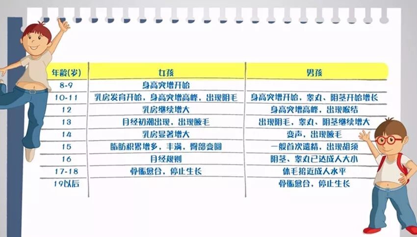 男孩青春期最早表现是睾丸增大,容积达4毫升,长度为2.5厘米(一粒枣子大小),一般在10~12岁,最迟14岁。然后是阴囊发育,色素沉着,阴茎发育,一般在11~12岁,阴毛发育在12~13岁 ,继之出现腋毛、痤疮、声音变调。初次遗精多在14~15岁, 15岁左右长胡须。
